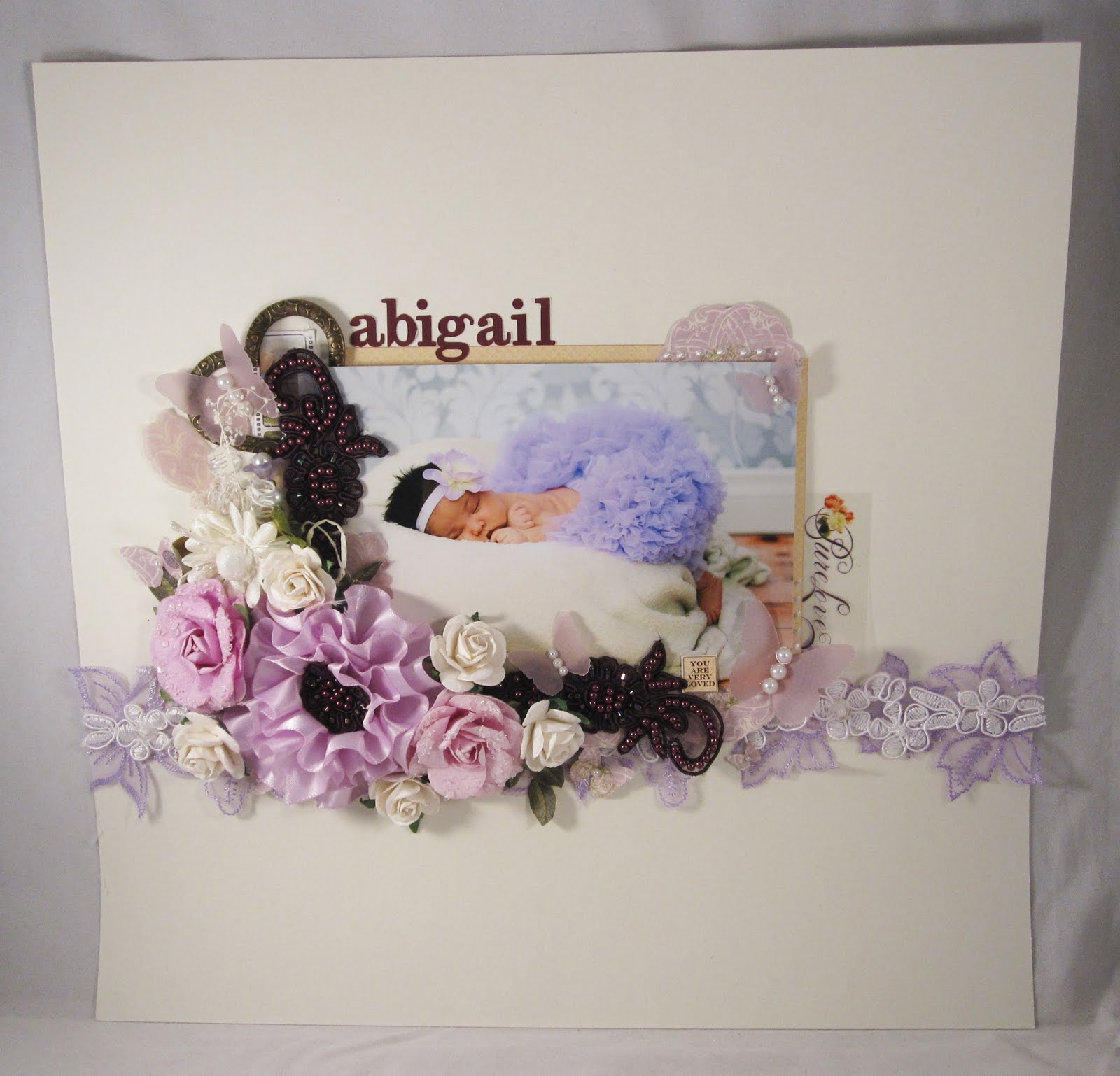I have had this idea for this layout since I got the gorgeous trims from TPBP. Using mostly embellishments and lace and very little paper. I did use a little bit of Websters Pages Hollywood Vogue paper. I used some fabulous flowers from Prima and Wild Orchid Crafts. I also tried out Tammy's ruffle flower trim Tutorial. I love love how it turned out. The ruffle trim that Bev sells is so soft and gorgeous. I layered 2 different laces on top of eachother. I glimmer misted the bottom layer. it came out gorgeous. I punched out some butterflies from some vellum. This layout was so much fun to make and Bevs trims made it so gorgeous.
