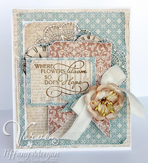 For my card I used Graphic 45 A Ladies Diary collection. I just distressed and layered the papers. I cut out a couple of the clocks in the paper. I used some doily die cuts and I used Distress ink in vintage photo to stamp the sentiment. The stamp is Where flowers boom plain jane. I used a Petaloo flower and some seam binding.